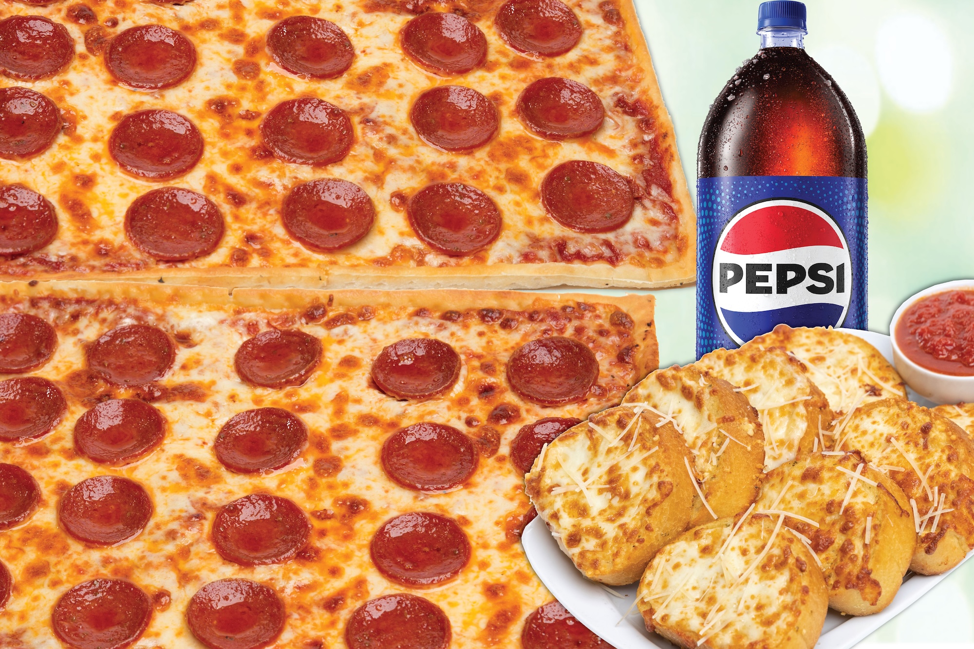 2 14" 1-Topping Pizzas + Large Cheesy Garlic Bread + 1-2 Liter Soda