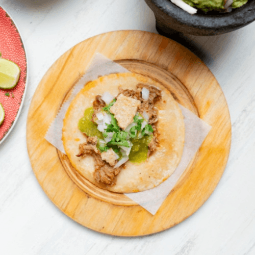 Pulled pork, salsa verde, cilantro onion, pork rind