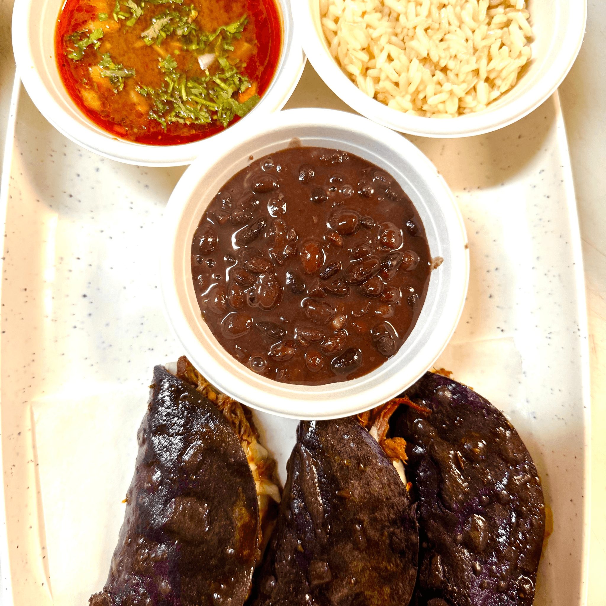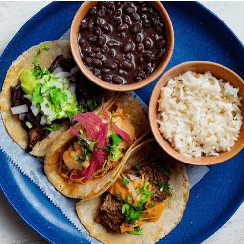 3 Tacos of your choice (Chicken Tinga, Braised Beef, Portobello Mushroom, Carmitas); includes side of White Rice and Black Beans.