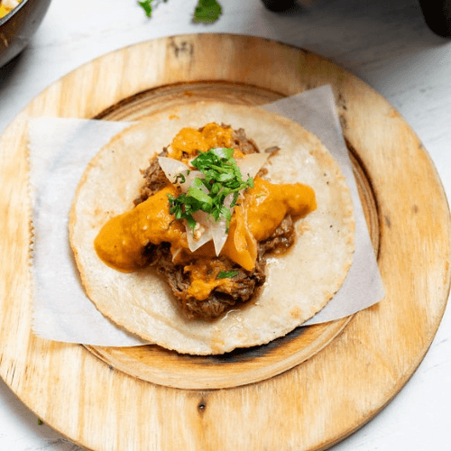 Braised Beef Taquitos, Smothered with a salsa Chile Morita, Queso Fresco, Crema, Cilantro Garnish, Pickled Onion