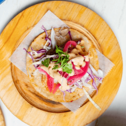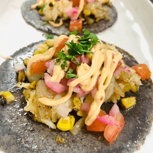 Fresh corn masa filled with chorizo, potato, cheese, mole sauce, crema, pickled red onions, fresh sweet plantain, two eggs.