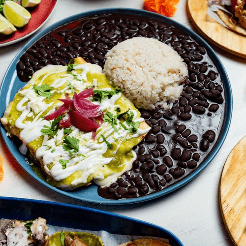 Chicken or Braised Beef topped off with rich mole Poblano, crema and queso fresco, rice