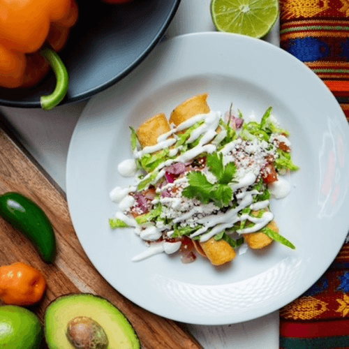 3 Crispy Chicken Stuffed Taquitos, Pico de Gallo, Crema, Queso, Lettuce