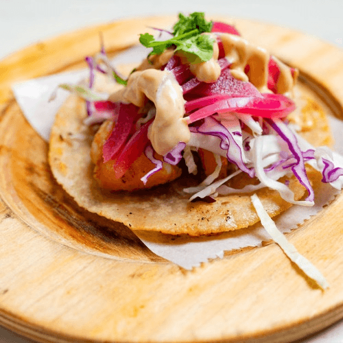 Seared shrimp, cabbage, red onion, chipotle mayo, cilantro