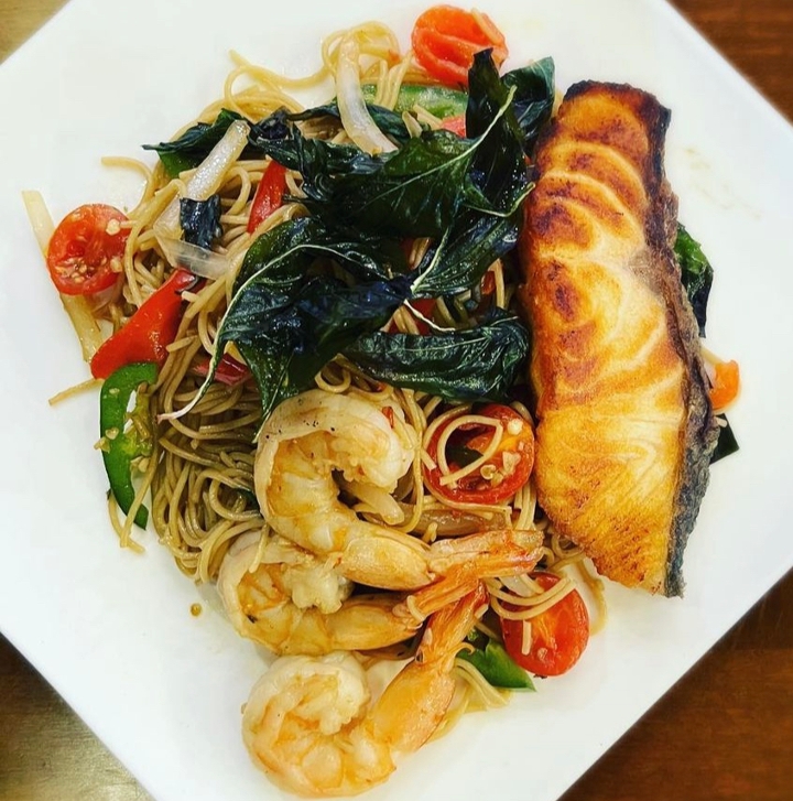 Stir-fried angel hair / grilled salmon / shrimp / onion / tomato / red bell pepper / basil / chili garlic sauce