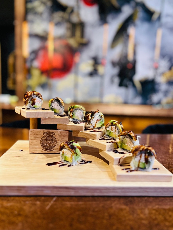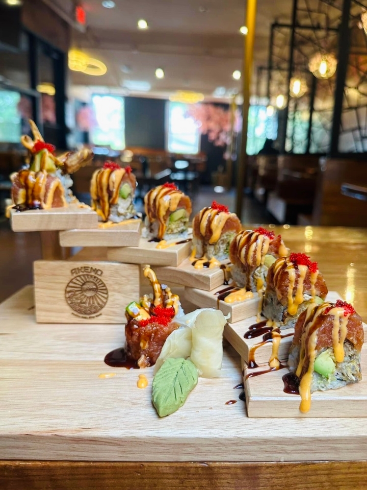Crab meat / avocado / cream cheese / crunchy / spicy mayo / eel sauce and creamy sesame aioli