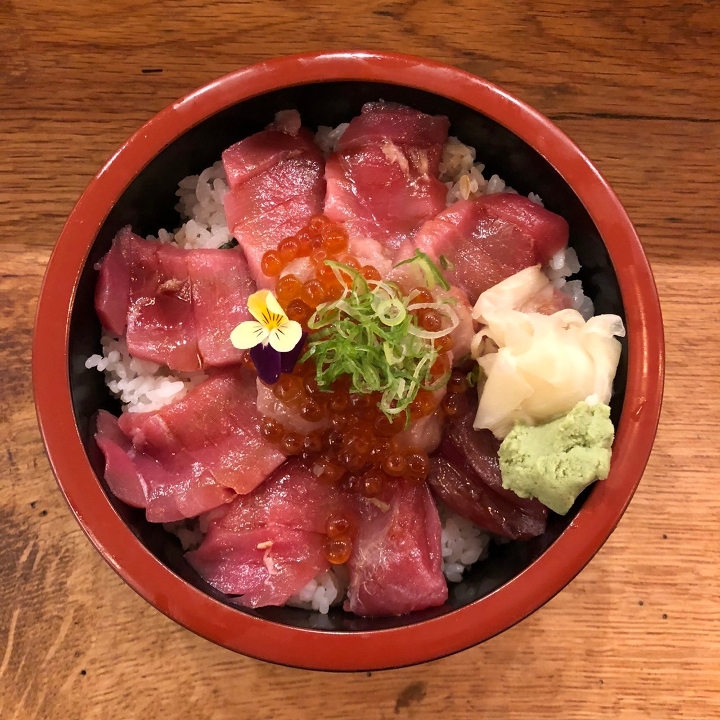 Blue fin tuna sashimi / chopped spicy tuna / Ikura / scallion on topped of rice