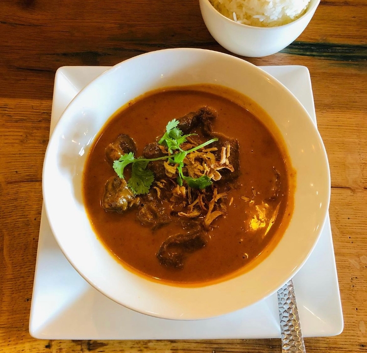 Slow cooked angus beef to soft and tender / potato / crispy onion / peanut / sweet mind curry sauce served with Jamine rice