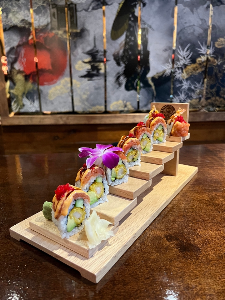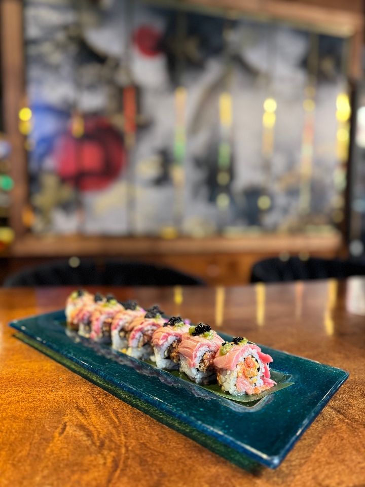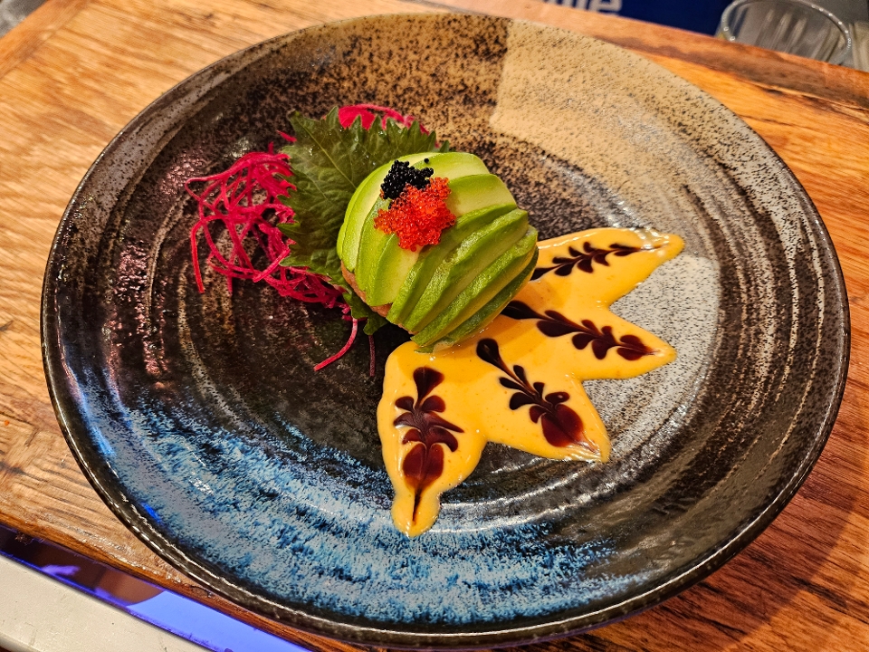 Spicy crunchy yellowtail topped with yellowtail / avocado / tobiko / jalapeno / black pepper sauce