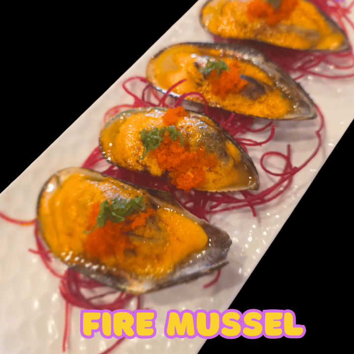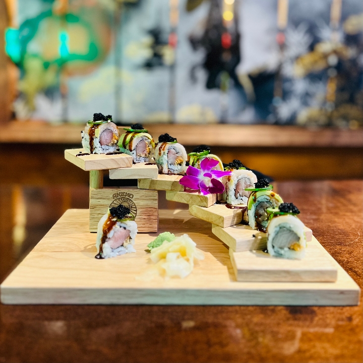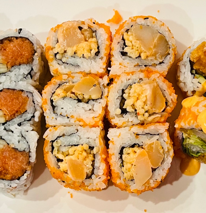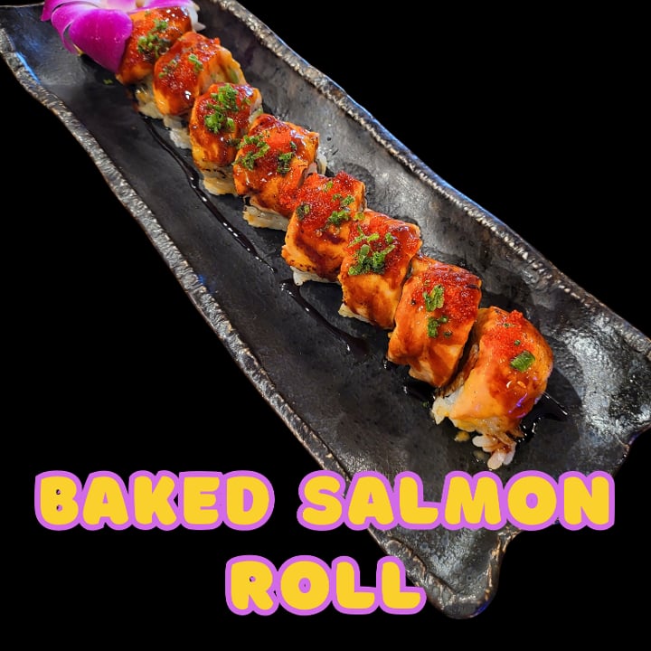 Imitation crab / avocado topped with baked salmon / masago / scallion / eel sauce / spicy mayo