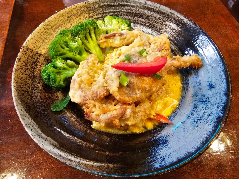 Lightly battered deep fried 2 Soft Shell Crabs served with Panang curry & egg sauce / red bell pepper / scallion / Jasmin rice