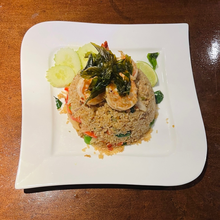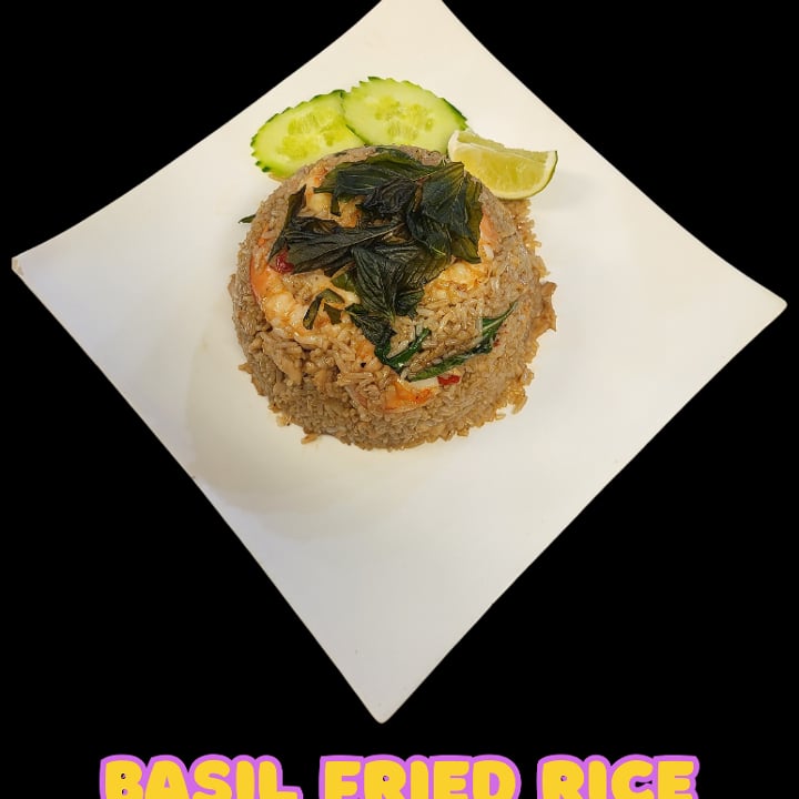 Spicy fried rice / shrimp / chicken / onion / pepper / basil / crispy basil / chili basil sauce
