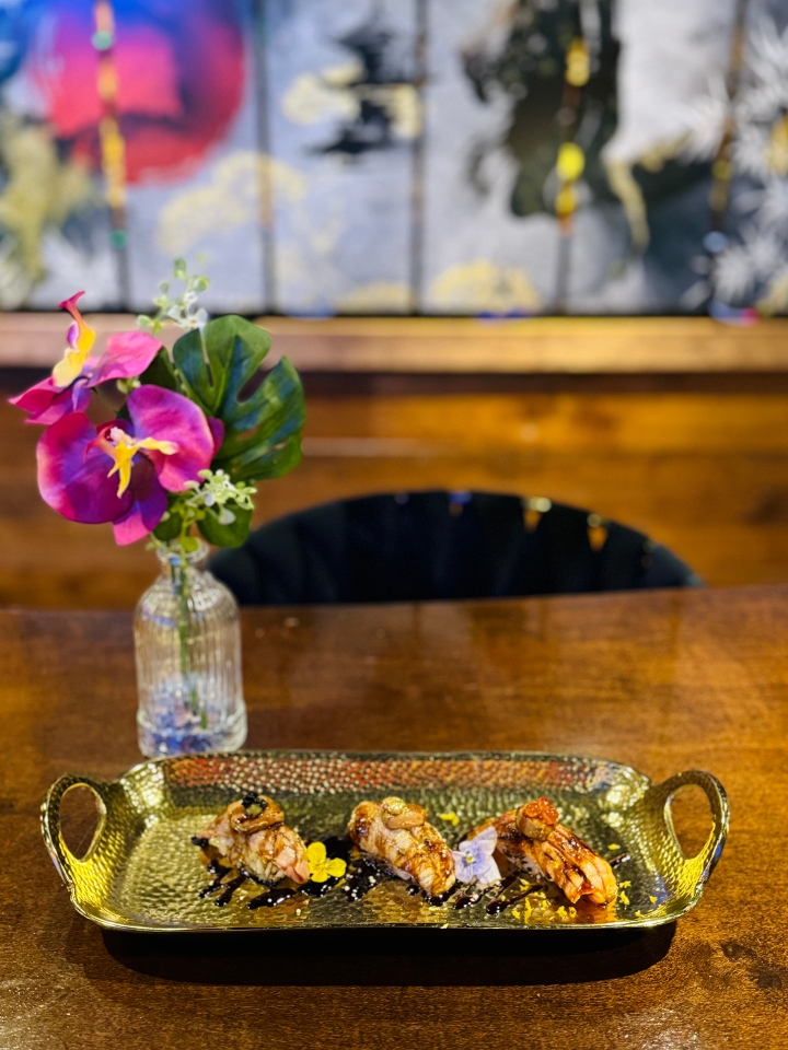 Shrimp tempura / avocado topped with shrimp / masago / tempura flake / sweet chili sauce