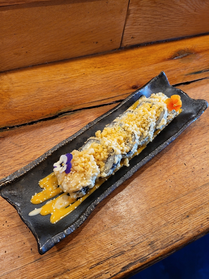 Shrimp tempura / imitation crab / cream cheese / avocado / topped crunchy / eel sauce