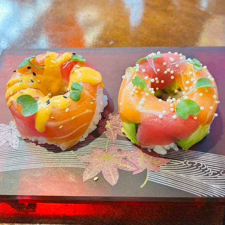 Spicy fatty tuna / oshinko / scallion top with seared full fatty tuna / tobiko / wasabi orange vinaigrette sauce