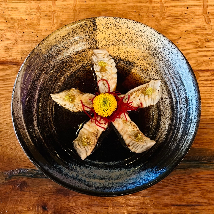 Seared halibut sashimi / yuzu kosho / ponzu / garlic paste