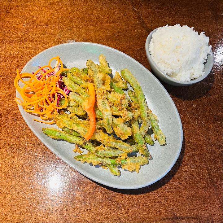 Lightly battered deep fried long string bean / garlic pepper sauce served with Jasmine rice