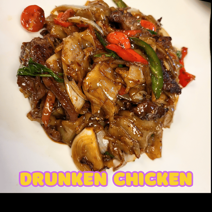 Stir-fried wide rice noodle / onion / basil / tomato / chili garlic basil sauce.