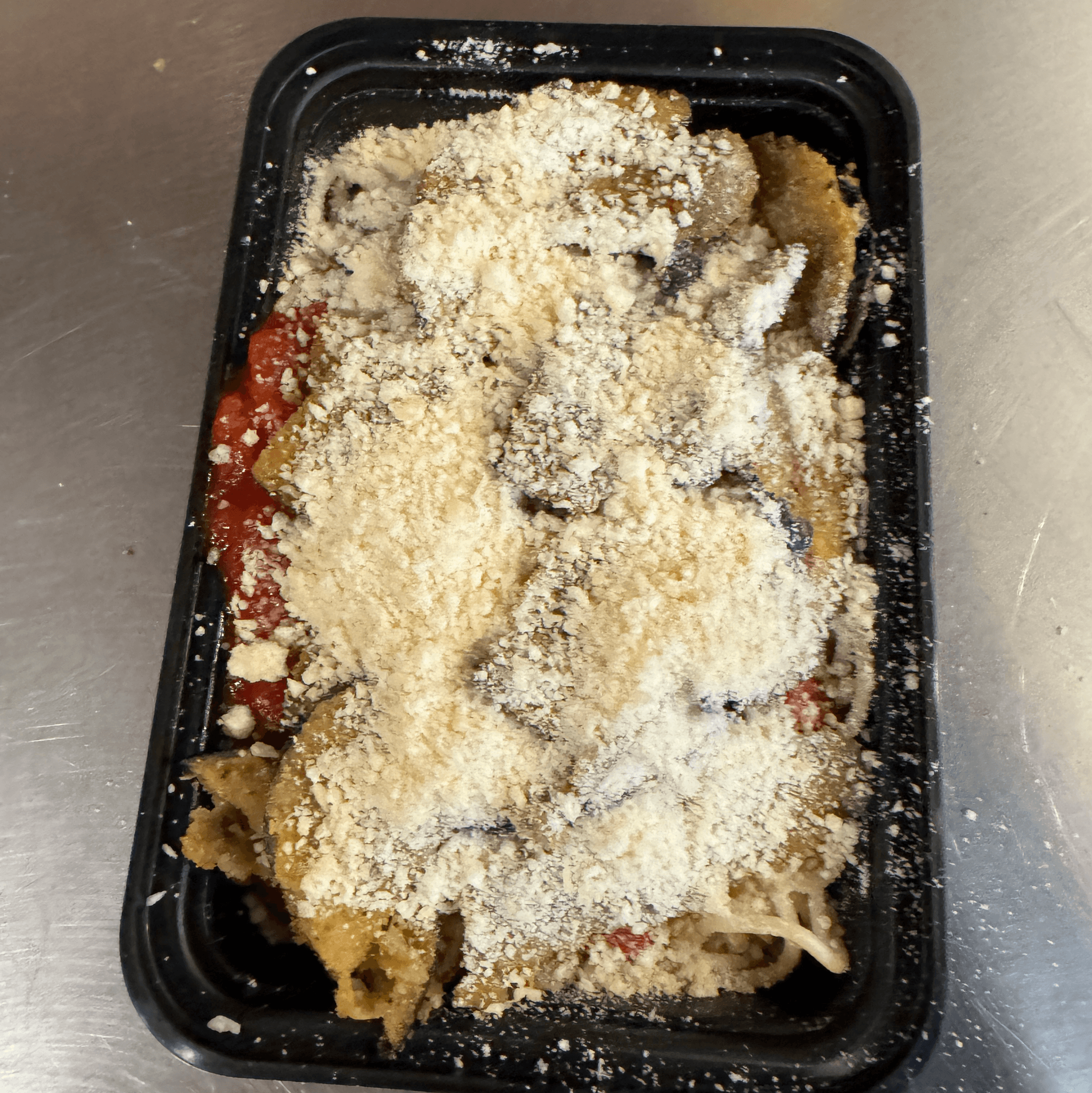 Spaghetti pasta, homemade marinara sauce and topped with parmesan cheese