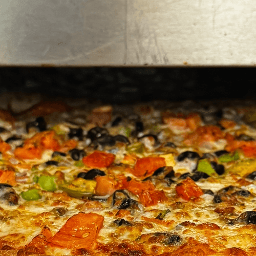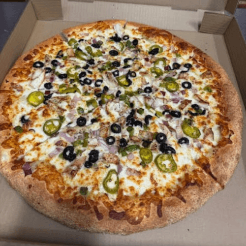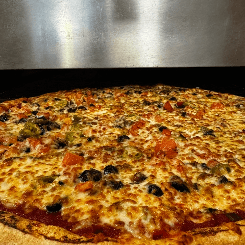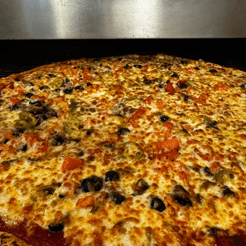 Tatiana secret sauce, fresh tomatoes, black olives, red onion, green pepper, ground beef, Italian salami, feta cheese and topped with tatiana three blend cheese