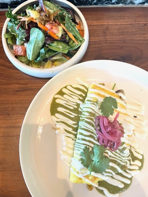 Three eggs omelet, potatoes, cauliflower, tomato, mole verde, ensalada (v)