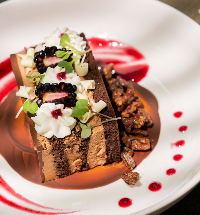COCOA CAKE, CACAO MOUSSE, FRESH BERRIES, CARAMELIZED PECANS (GF)