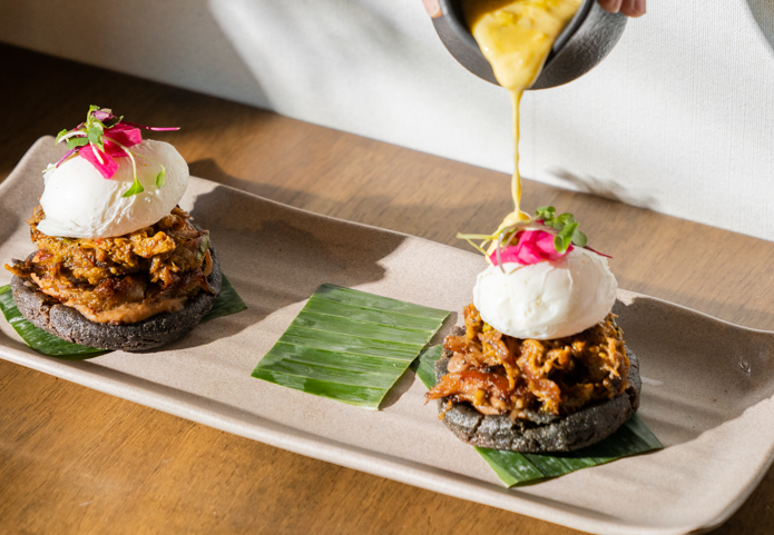 Two housemade sopes, refried pinto beans, carnitas con morita sauce, poached eggs, Hollandaise sauce