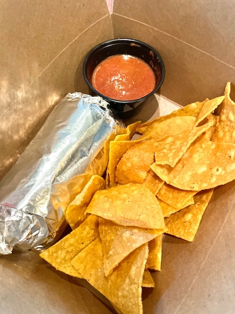 Grilled chicken, rice, pico de gallo, chihuahua sauce, tortilla chips and salsa molcajete.
