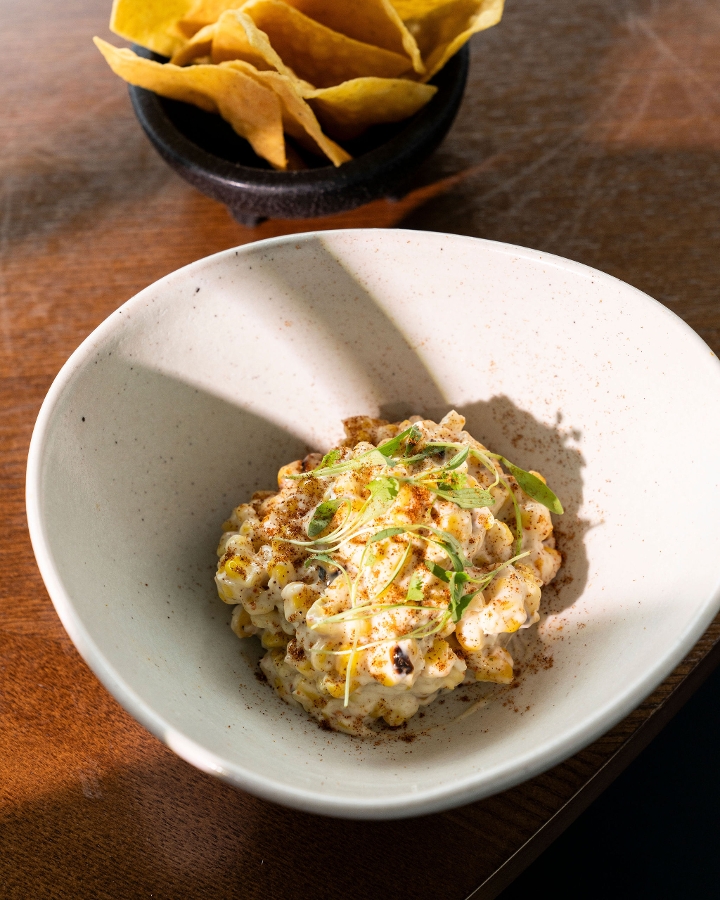 CRISPY CARNITAS, HALF AVOCADO STUFFED WITH ROASTED CORN AND GRATINATED CHEESE, CHERRY TOMATO, RED PICKLED DAIKON, RED ONION, FETA CHEESE
