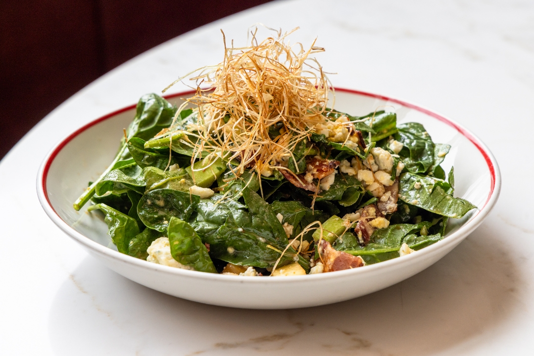 Baby spinach with bacon, blue cheese, apple, and hard-boiled egg with sweet balsamic onions & lightly fried shallots. Served with a sherry vinaigrette on the side.