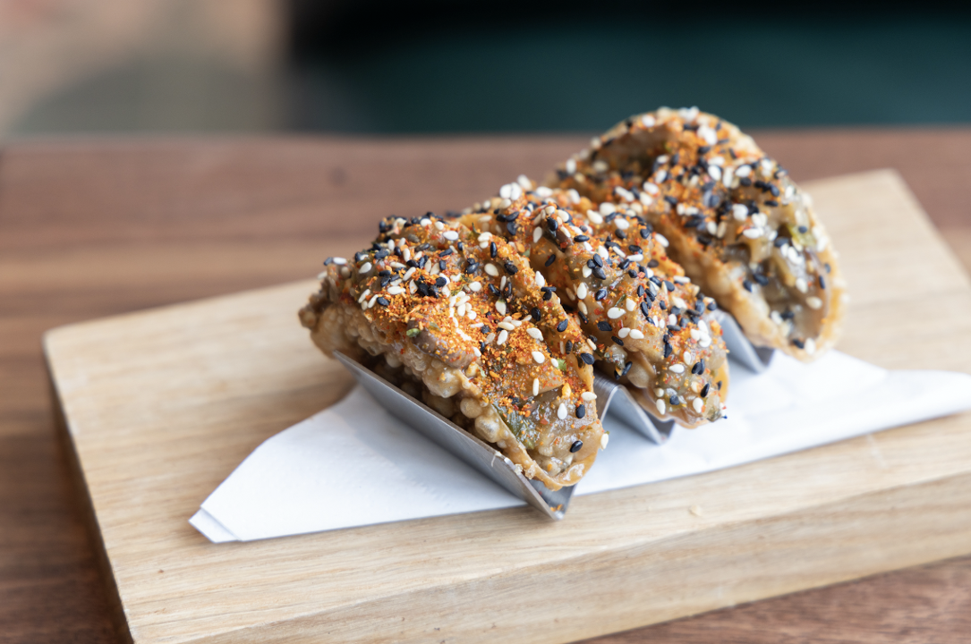 Three of our mini wonton tacos are filled with roasted eggplant & shiitake mushrooms, togarashi spicy mayo, and topped with toasted black & white sesame seeds.