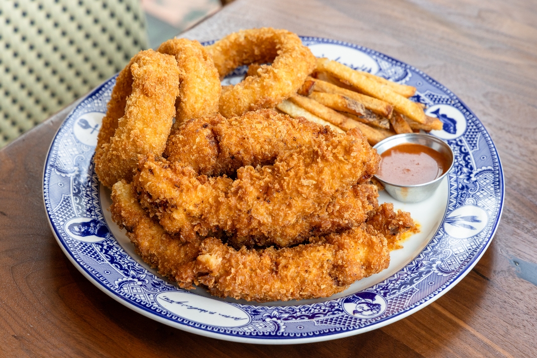 Fried chicken tenders on a bed of crisp mixed lettuce, bacon, cheddar, avocado, onion, and tomato. Served with champagne vinaigrette, buttermilk ranch dressing, and honey mustard dressing on the side.