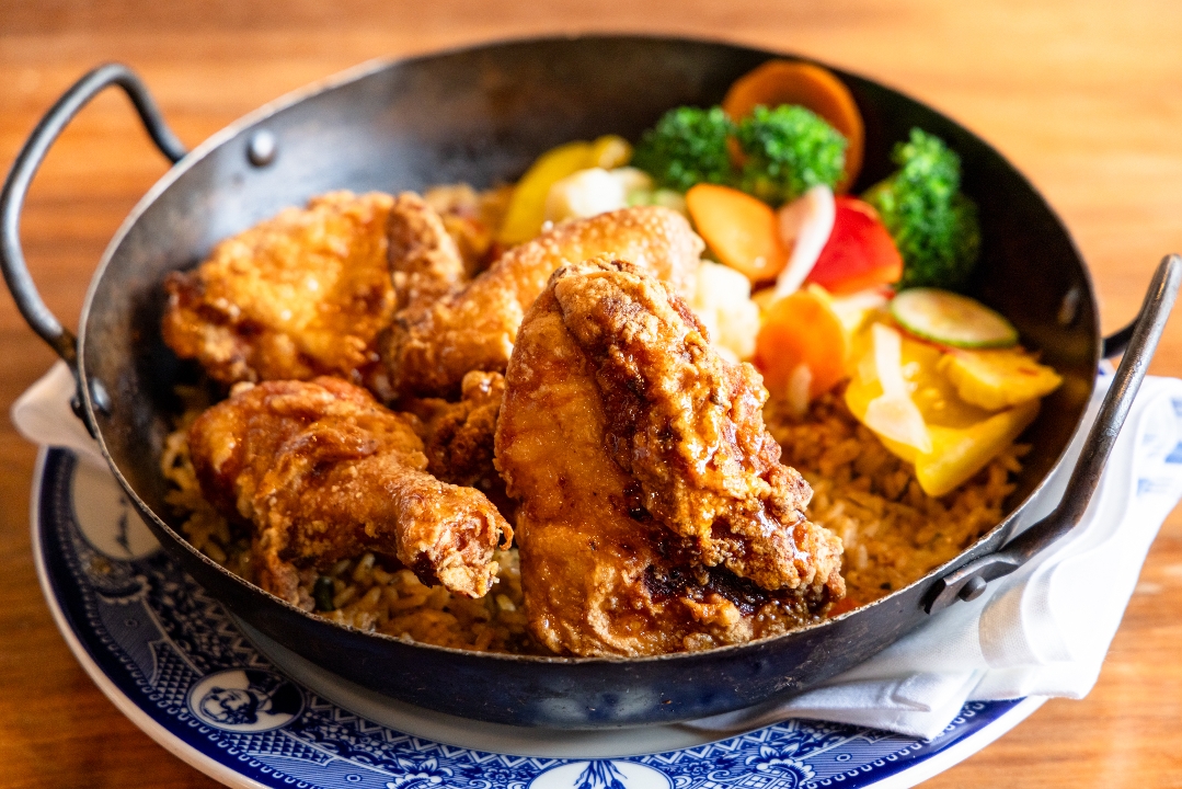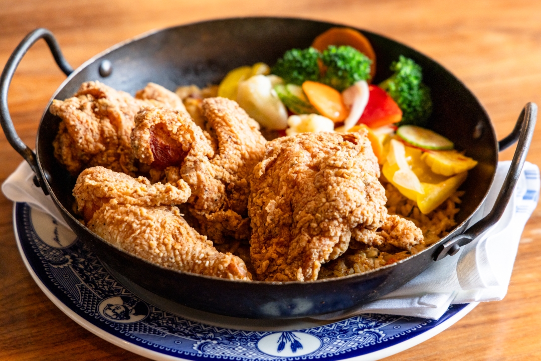 Scratch-made jambalaya with green pepper, poblano, onion, and spices topped with our spicy fried chicken and escabeche salad.