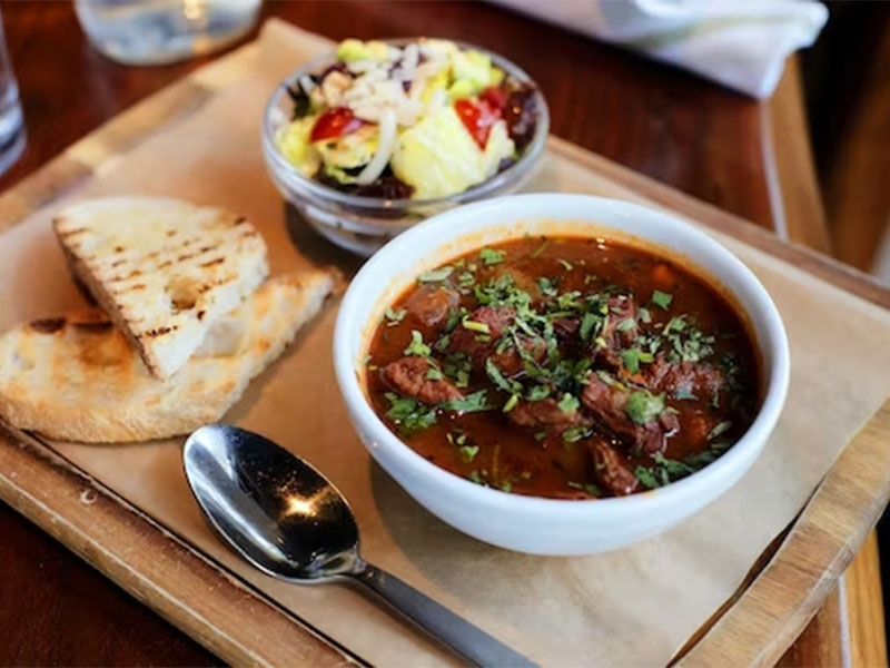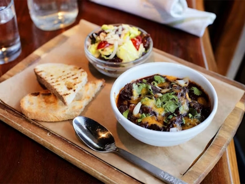 Kidney beans, American lager, and onion with grated cheddar cheese. Served with grilled sourdough and a small Farmers Salad.