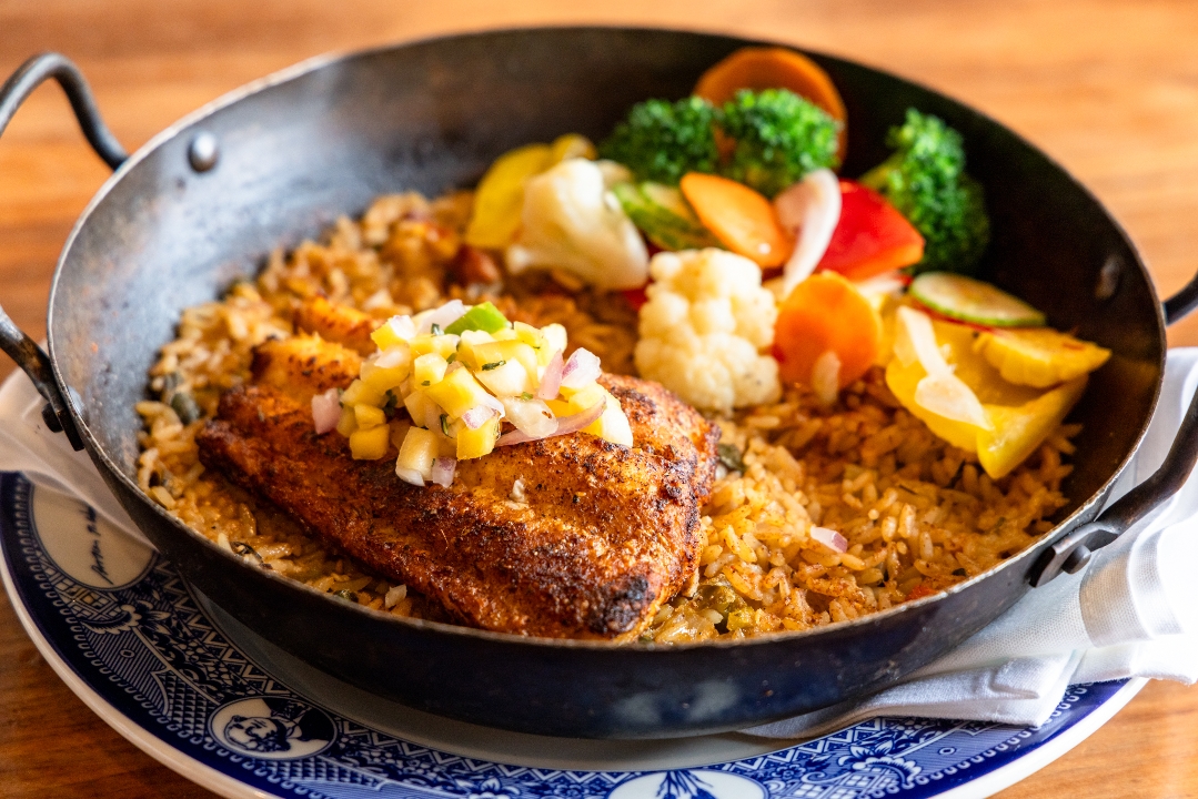 Scratch-made jambalaya with green pepper, poblano, onion, and spices topped with our blackened Chesapeake wild blue catfish, mango pico de gallo, and escabeche salad.