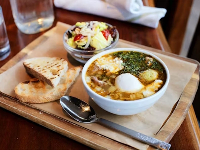 Topped with a poached egg, avocado salad, cotija, cilantro, and lime. Served with grilled sourdough and a small Farmers Salad.