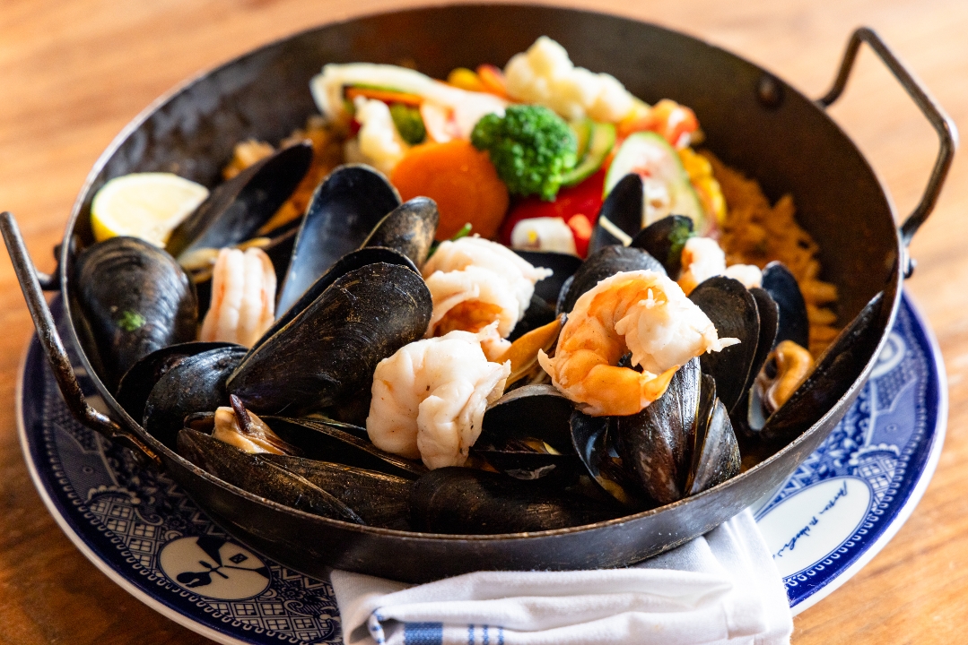 A medley of fresh mussels and shrimp atop our scratch-made jambalaya with green pepper, poblano, onion, spices, and escabeche salad.