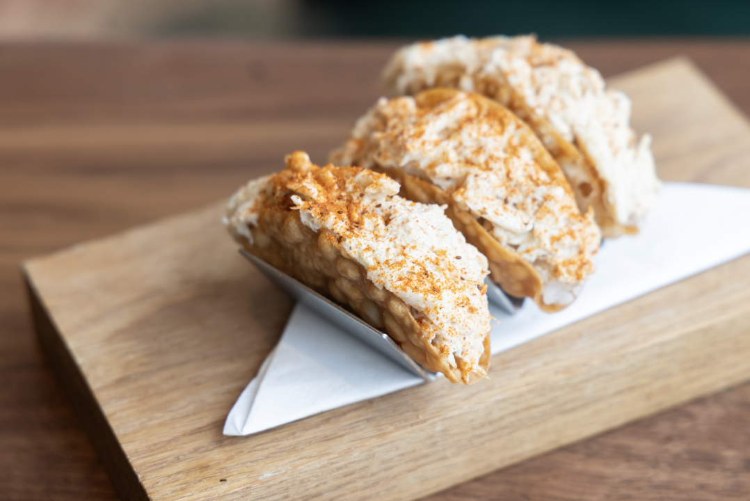 Three of our mini wonton tacos are filled with sushi rice, crab, tartar sauce, and topped with Old Bay seasoning.
