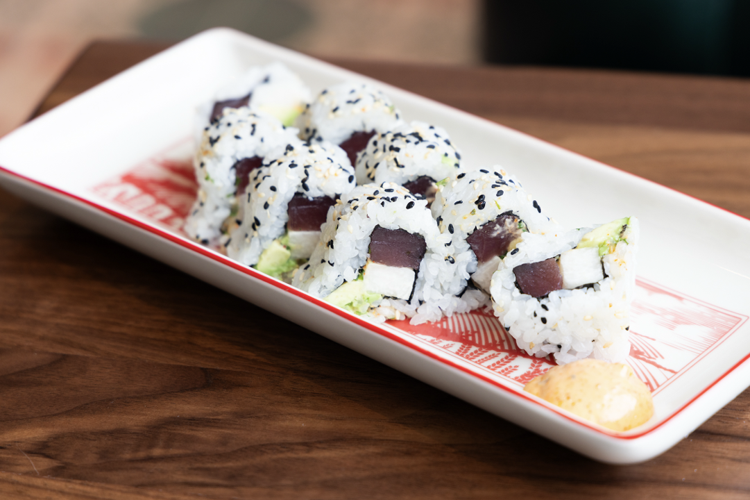 Ahi tuna, creamy avocado, and crisp jicama, all wrapped in perfectly seasoned sushi rice and toasted nori. Finished with a sprinkle of black and white sesame seeds and served with a side of togarashi spicy mayo.