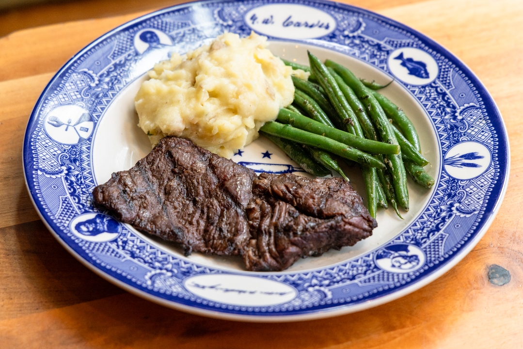 Our classic skirt steak is seasoned and grilled to a temperature of your choosing. Served with creamy mashed potatoes and choice of one side.
