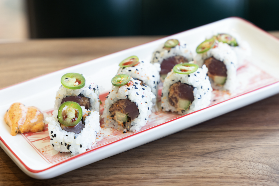 Spicy tuna, cucumber, togarashi spicy mayo, serrano peppers. Made with sushi rice, wrapped with your choice of toasted nori or sesame soy paper.