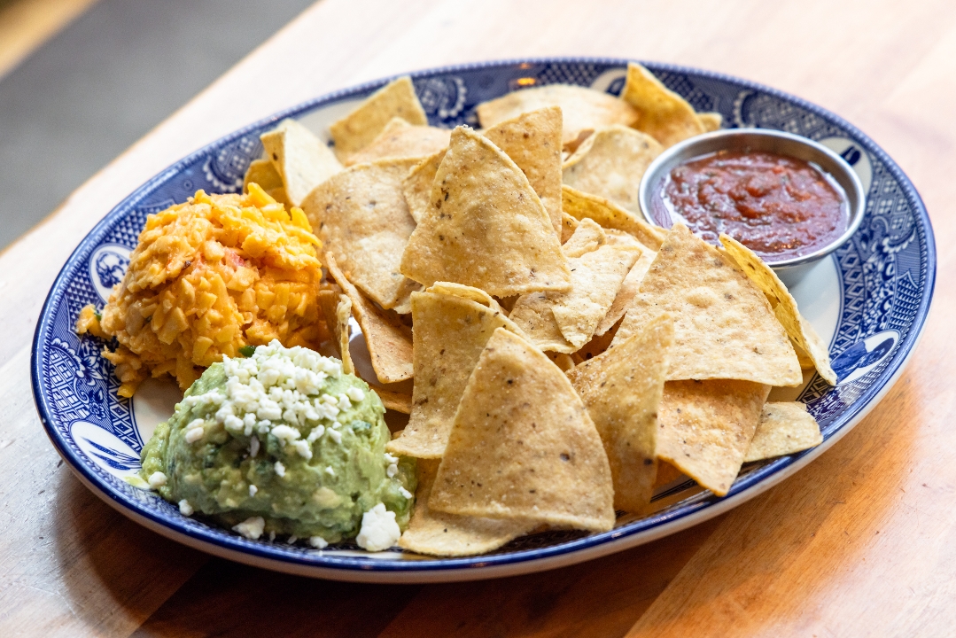 Crunchy corn tortillas served with sides of house-made guacamole, Farmers salsa, and pimento cheese.
