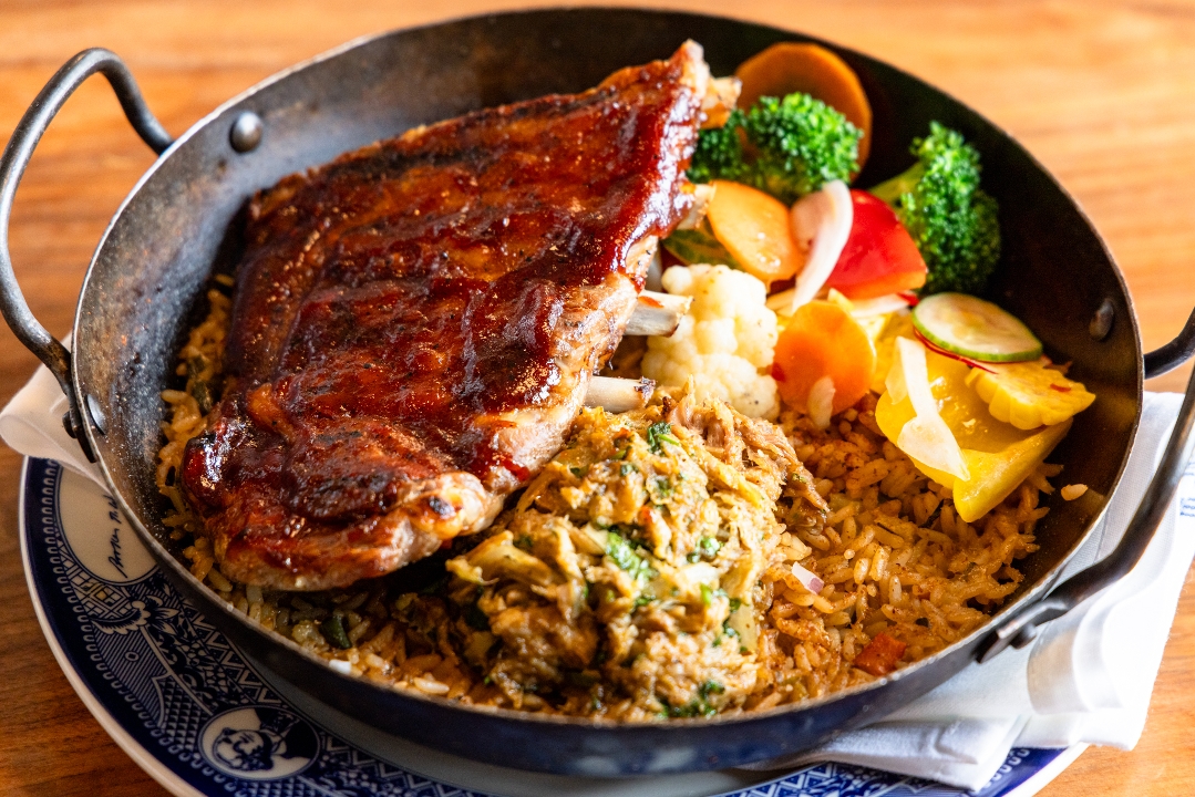 Scratch-made jambalaya with green pepper, poblano, onion, and spices topped with our pulled pork, ribs, and escabeche salad.