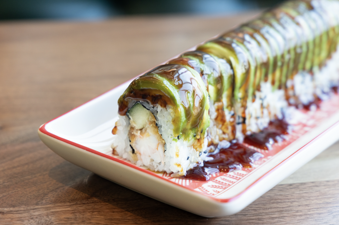 Crispy fried shrimp, cucumber, and avocado are wrapped in seasoned sushi rice and toasted nori. Topped with black and white sesame seeds and drizzled with eel sauce.