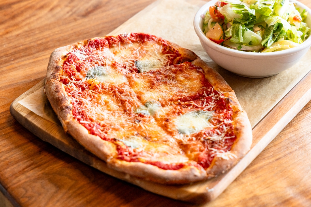 A personal size Margherita pizza served with our Italian Marinated Tomato & Aged Provolone Salad (chopped romaine, cucumbers, thinly sliced radish, marinated tomatoes, fennel, red onion, and aged provolone with a red wine vinaigrette on the side).