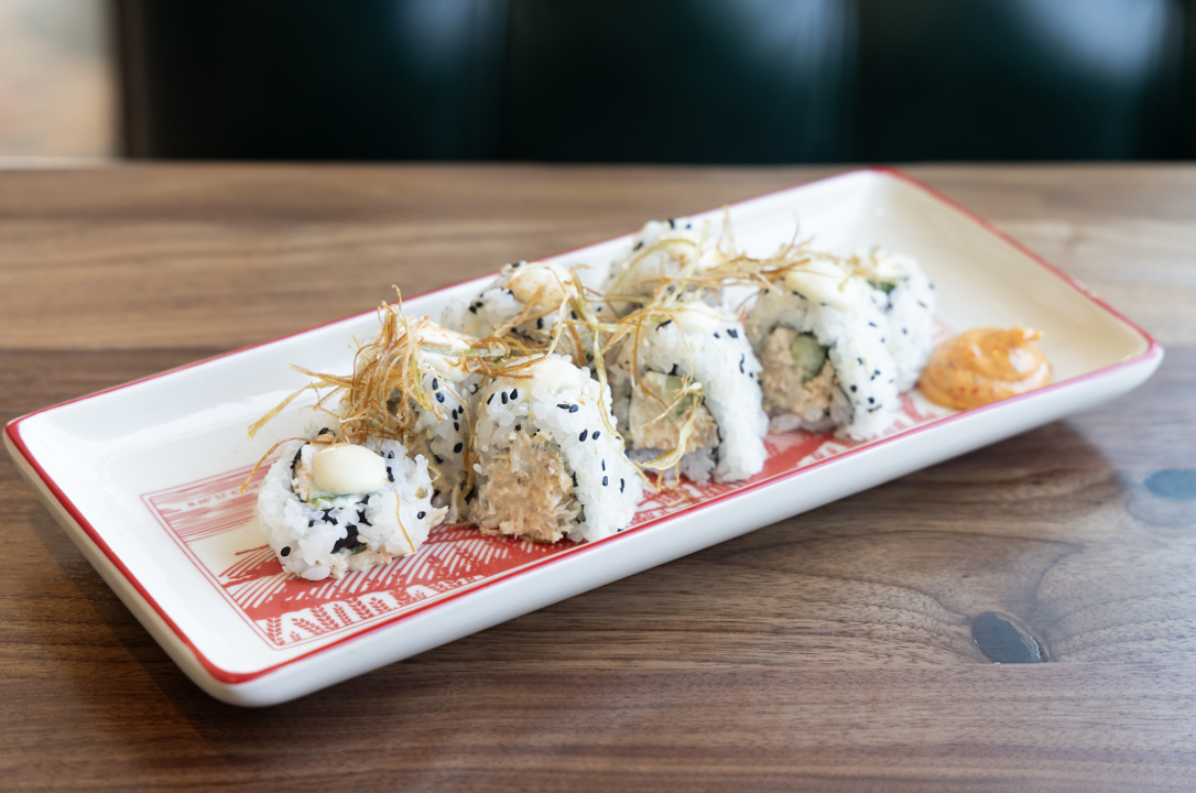 Spicy old bay crab, avocado, cucumber, fried leeks, and mustard aioli. Made with sushi rice, wrapped with your choice of toasted nori or sesame soy paper.