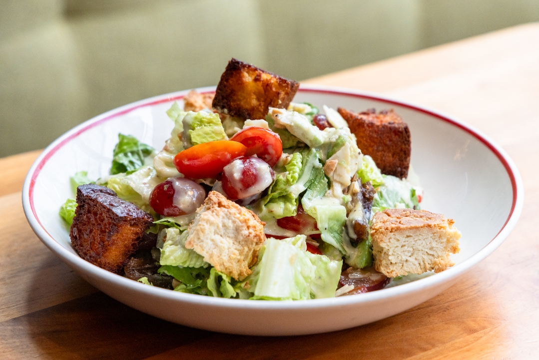 Fresh & crisp little gem lettuce, pecorino romano & parmesan cheeses, and our house-made cornbread & buttermilk biscuit croutons to add the perfect crunch. Served with our classic Caesar dressing on the side.
