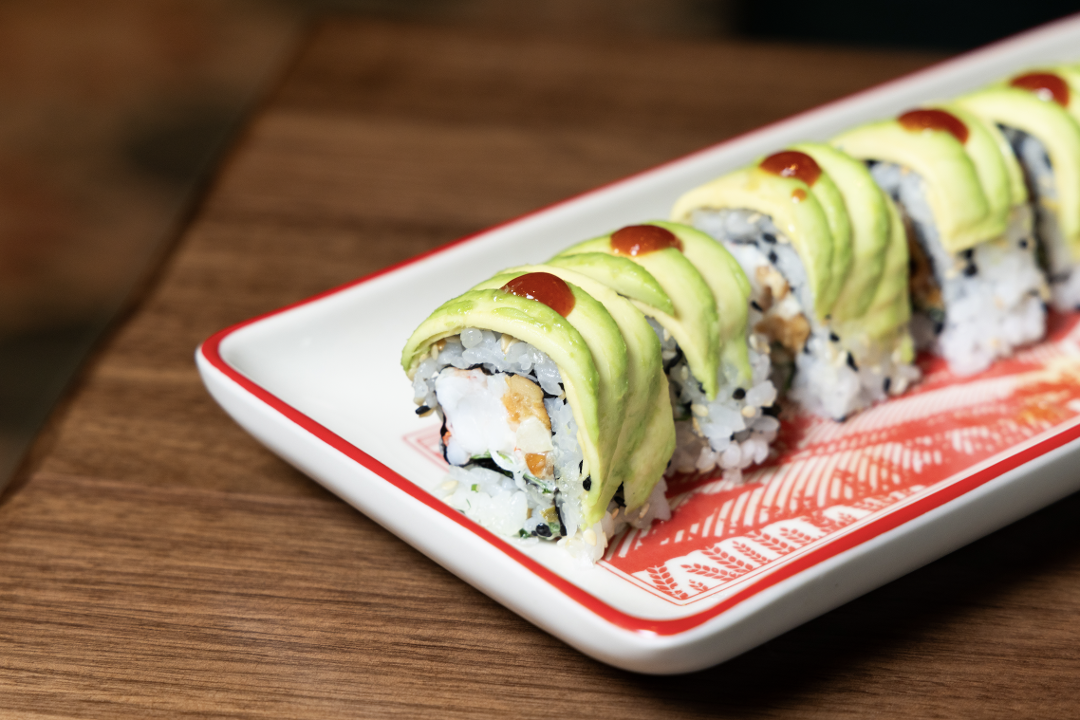 Poached shrimp, creamy avocado, and crunchy macadamia nuts are wrapped in seasoned sushi rice and toasted nori. Finished with black and white sesame seeds, fresh chives, and cilantro. A drizzle of olive oil, a touch of tartar sauce, and a kick of sriracha bring it all together.