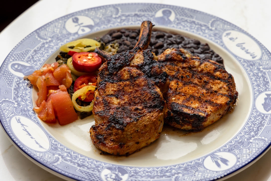 Our twin pork chops are brined, seasoned, and grilled to perfection. Served with black beans, braised collard greens & cabbage, pickled banana & cherry peppers, and sweet & sour tomatoes.