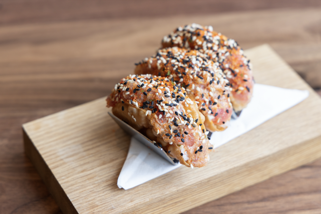 Three of our mini wonton tacos are filled with sushi rice, spicy tuna, spicy mayo, and topped with toasted black & white sesame seeds.